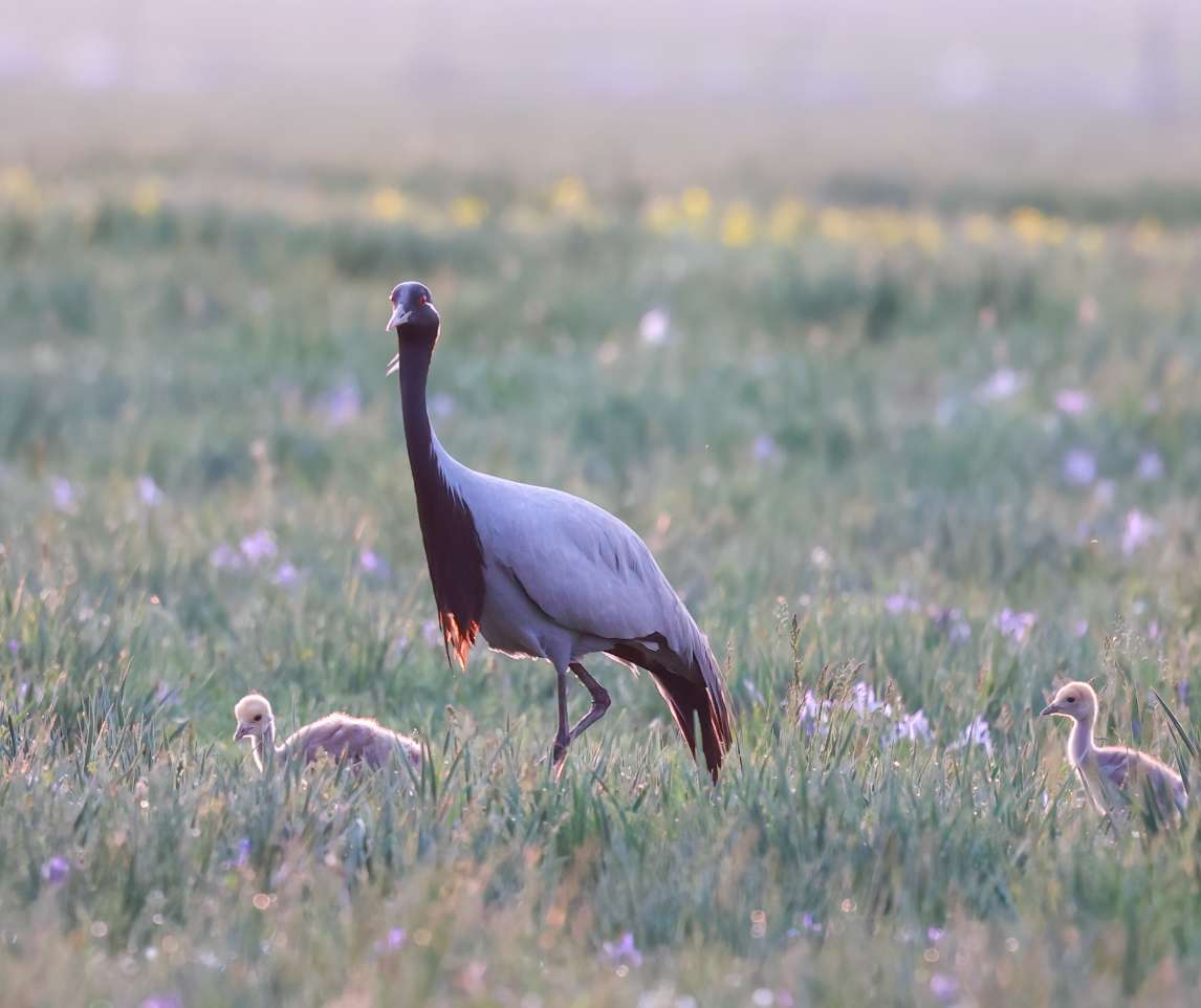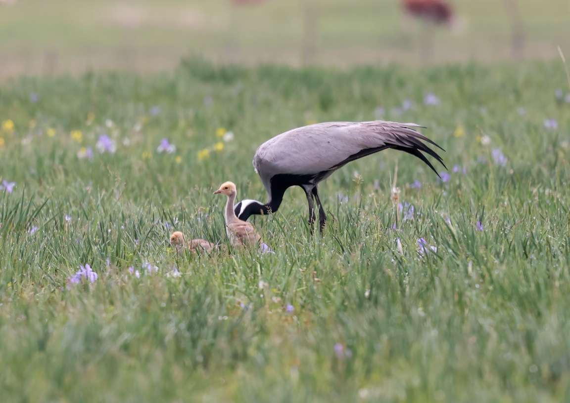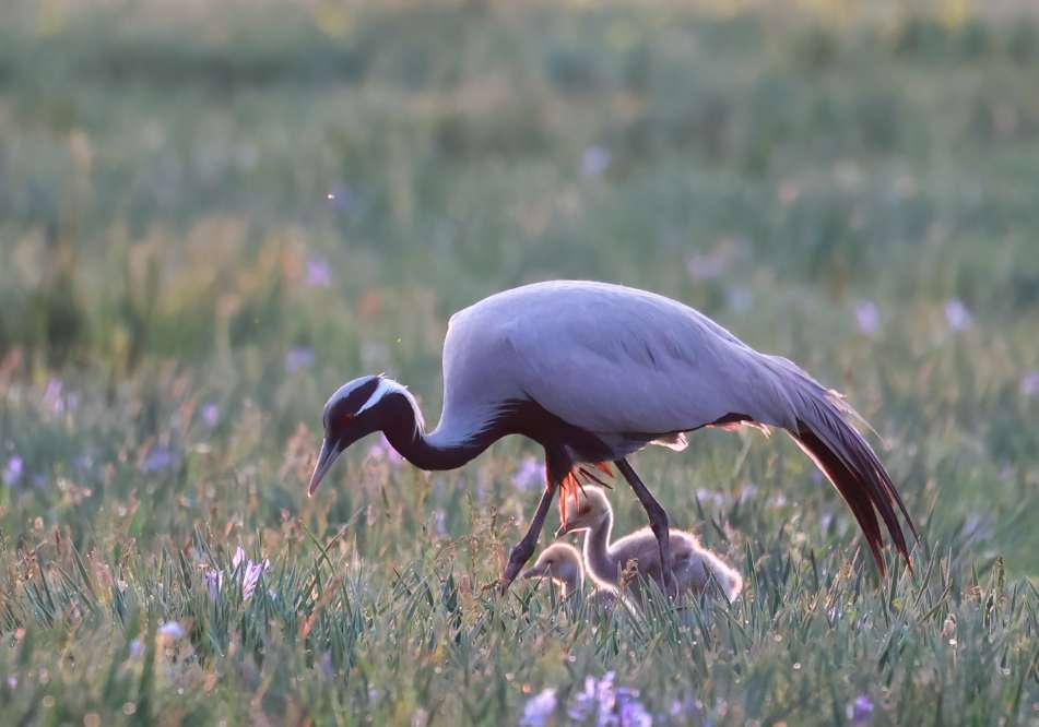 蓑羽鹤在草原上“遛娃”的场景太温馨