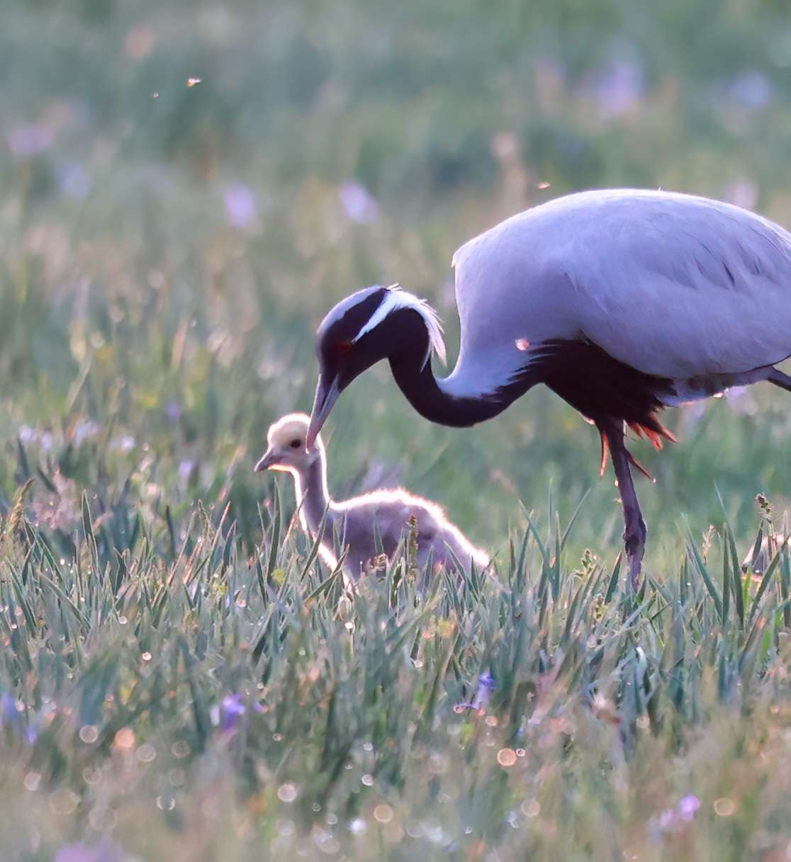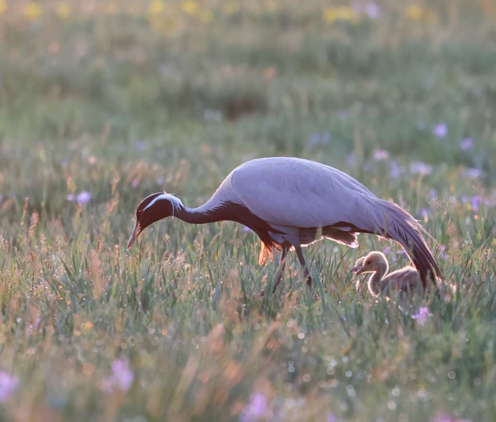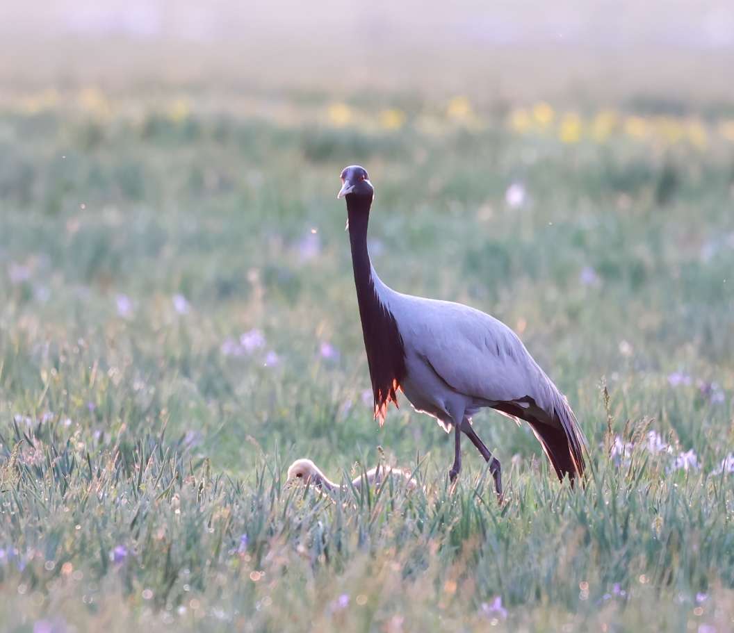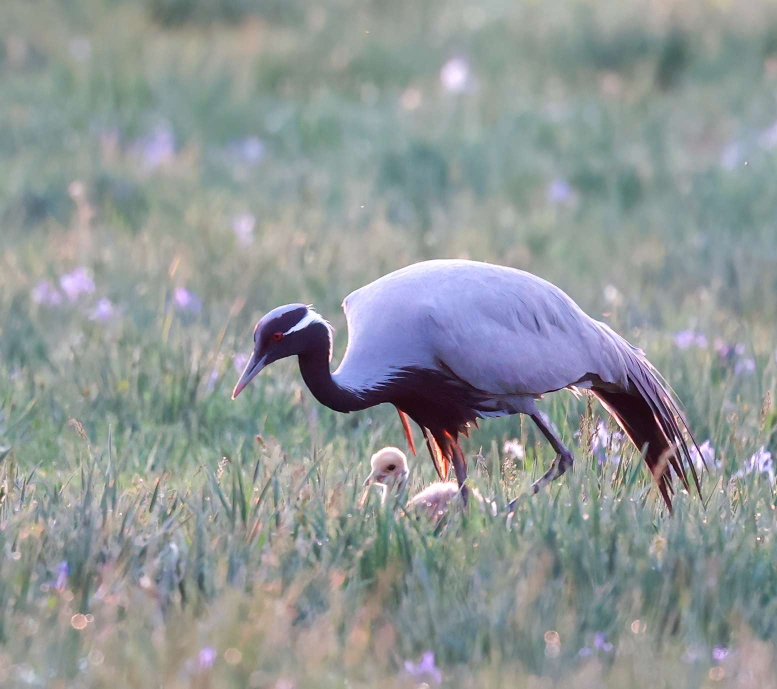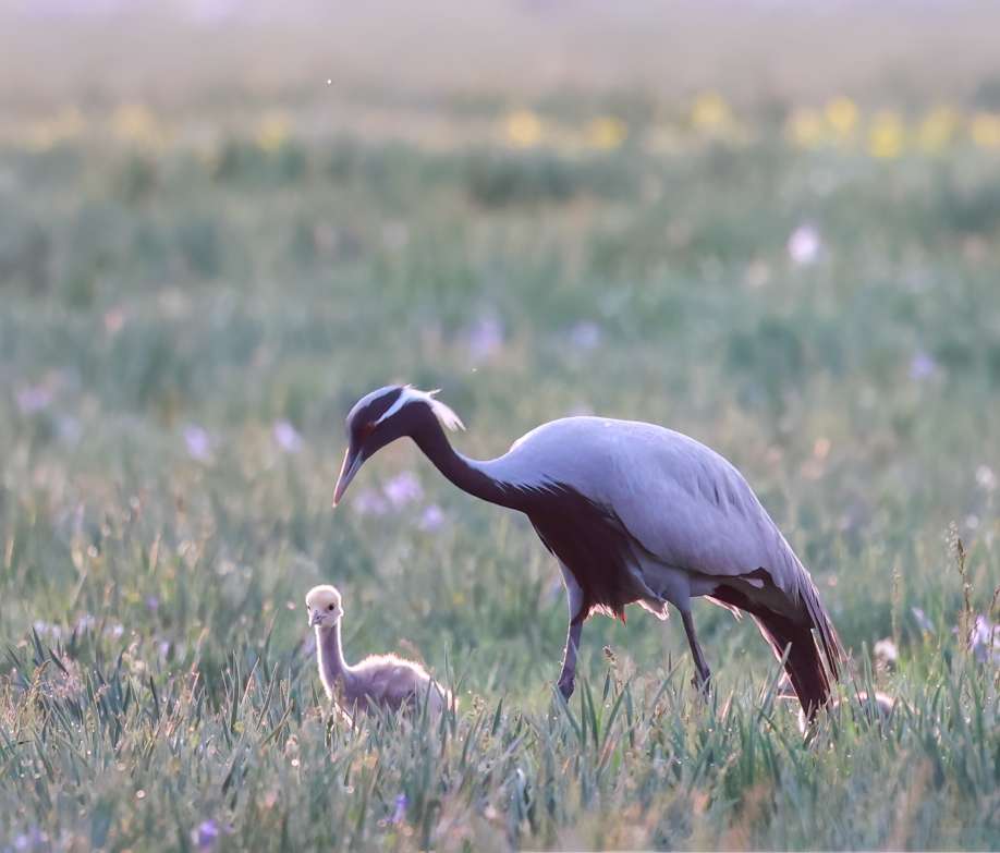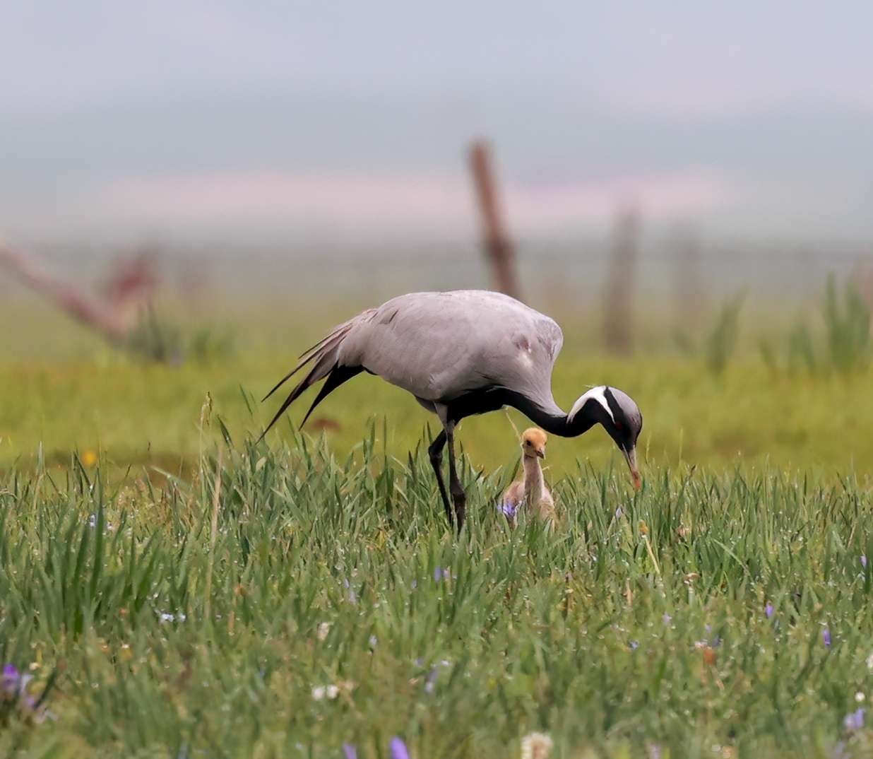 蓑羽鹤草原遛娃是自然生命中最坚韧而温柔的诗篇之一。它们优雅的身影穿行于花草之间,纤弱却顽强,每一次踱步、每一次守护,都是生命在荒野中的深情独白。